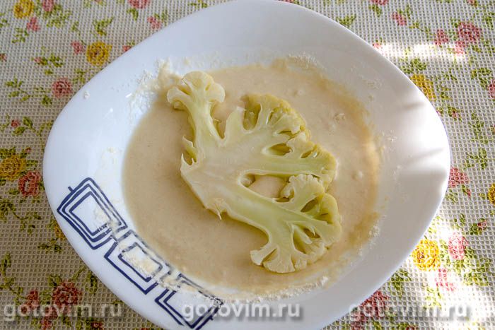 Опускаем каждую заготовку для капустного шницеля в кляр, стараясь покрыть тестом капусту с каждой стороны.