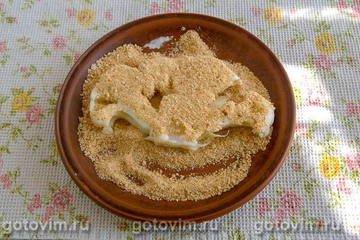 Затем перекладываем капусту в кляре на плоскую тарелку с панировочными сухарями.