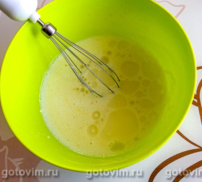 Добавить к сахарно-яичной смеси растительное масло. Эти панкейки от оладий отличаются сухим способом приготовления, то есть на сухой сковороде. Поэтому масло предполагается добавить непосредственно в тесто.