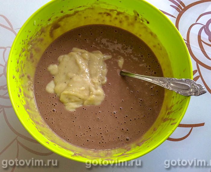 Ввести банановое пюре к остальному тесту. Тщательно размешать до однородной массы. Тесто для шоколадно-банановых панкейков готово. Оно должно быть средней густоты, легко стекать с ложки. Это обеспечит легкую работу с ним, удобное распределение на сковороде и для более ровной формы в готовом виде.