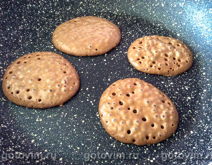 Процесс выпекания блинчиков прост. Для начала нужно на максимальном огне хорошо разогреть сухую сковороду без использования растительного масла. Затем огонь убавить до среднего, чтобы поверхность панкейков не горела, и середина равномерно пропеклась. Выкладывать тесто на сковороду удобно столовой ложкой, немного поправляя тесто, придавая панкейкам правильную форму.
