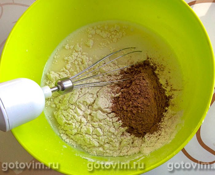 Муку просеять, смешать с разрыхлителем и солью. Если нет разрыхлителя, можно обратиться к классическому способу и заменить пекарский порошок на соду, гашеную 9% уксусом. Тщательно размешать муку. Ввести в получившуюся смесь молоко комнатной температуры. Просеять какао через ситечко, перемешать тесто для панкейков миксером до полного растворения комочков.