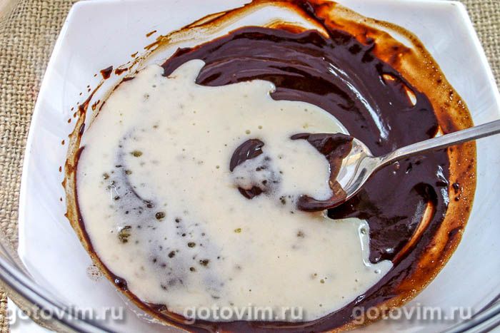 Шоколад поломать на кусочки и растопить на водяной бане. Желатин немного прогреть в микроволновке (буквально 7-10 секунд на максимальной мощности) или на водяной бане и влить в теплый шоколад. Оставшиеся желатиновые комочки без проблем растворятся. Перемешать.