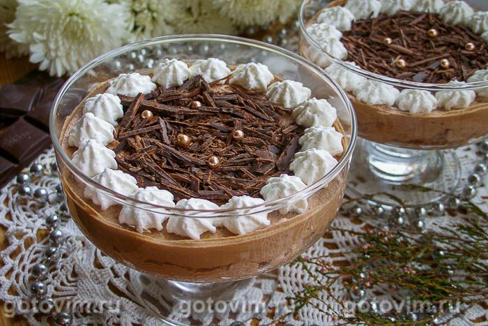 Разложить массу по креманкам. Украсить на свое усмотрение. Можно положить взбитые сливки в кулинарный шприц и отсадить небольшие цветочки, посыпать нарезанным шоколадом или какао-порошком. Поставить в холодильник минимум на 1 час, а лучше на всю ночь. За это время желатин застынет, и шоколадный мусс без яиц приобретет нужную текстуру. Приятного аппетита!