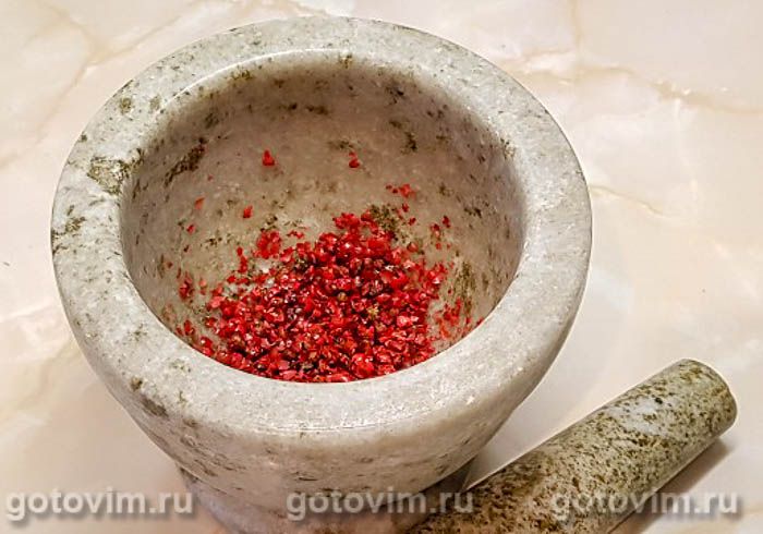 Растолочь розовый перец в ступке.