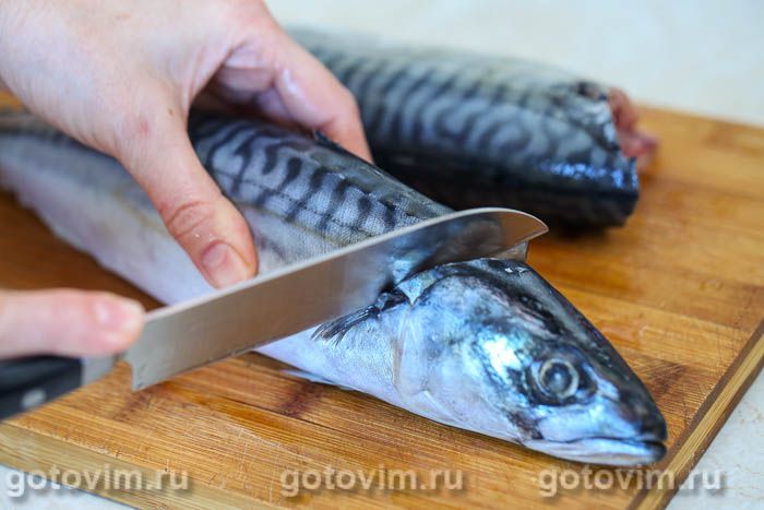 Скумбрию разморозить, отрезать головы, хвосты и плавники. Вскрыть брюшко, удалить внутренности и промыть снаружи и внутри под холодной проточной водой. Обсушить рыбу бумажными полотенцами и натереть со всех сторон солью. Уложить скумбрию в глубокую тарелку или другую посуда, в которой можно залить рыбу маринадом.