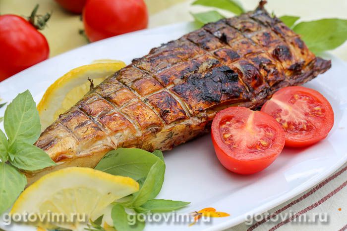 Скумбрию на решетке легко и приятно готовить, потому что не надо чистить чешую, да и сама рыба настолько сочная, что сложно испортить (пересушить) её на мангале. Маринад для гриля из скумбрии приготовила из смеси свежевыжатого лимонного сока с растительным маслом, чесноком и свежим ароматным укропом. Готовую скумбрию на решетки подают со свежими овощами, печеным картофелем, зеленью и соусом по вкусу.