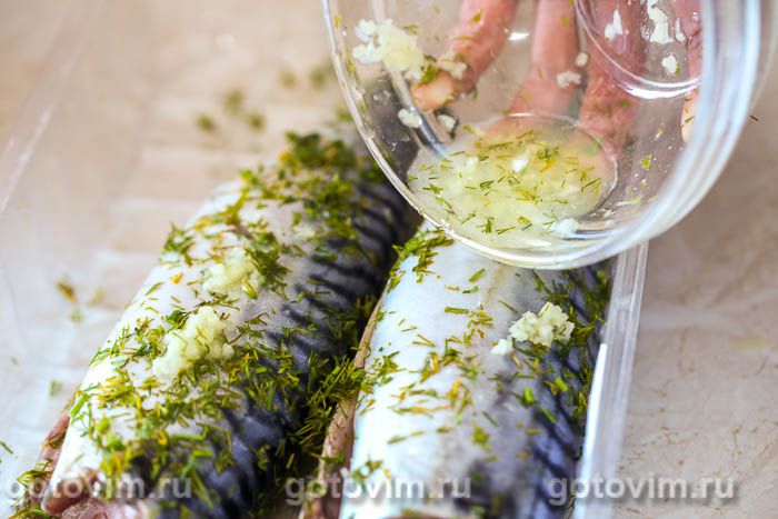 Залить маринадом рыбу, не забыв и про брюшко. Накрыть посуду со скумбрией пленкой и убрать в холодильник на 1-2 часа.