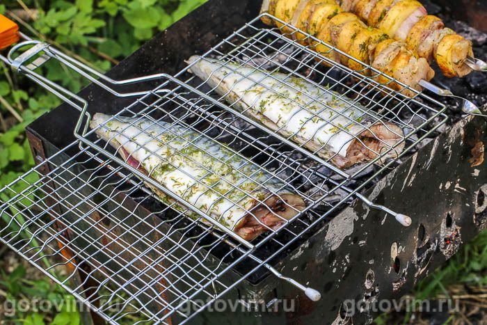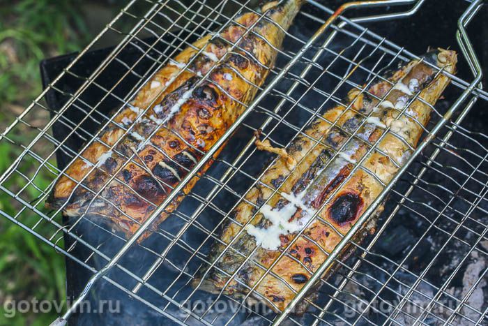 В мангале разогреть угли. Смазать решетку растительным масло, уложить тушки промаринованной рыбы, закрепить как положено и готовить с одно стороны, по ка бочок заметно не подрумянится.