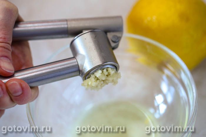 Для маринада смешать в небольшой миске лимонный сок, пропущенный через пресс чеснок, немного растительного масла и мелко рубленую зелень свежего ароматного укропа.