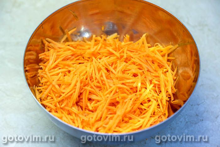 Морковь вымыть, очистить, натереть на крупной терке (или на соломкой).