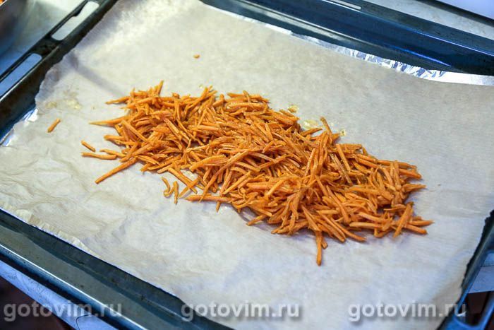 Противень застелить фольгой, на неё уложить бумагу для выпечки. На бумагу положить примерно треть тертой моркови.