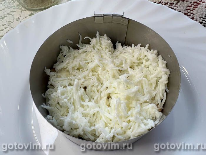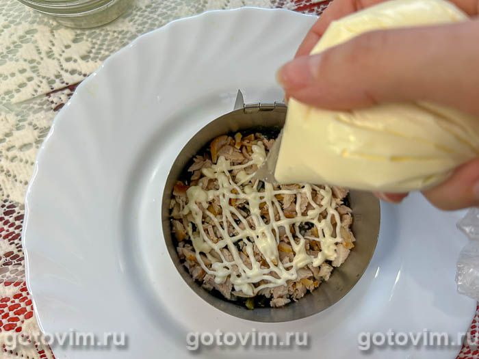 Отправить в салатное кольцо оставшееся куриное филе, распределить немного майонеза и на этот слой.