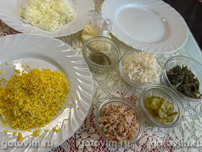 Салат удобно собирать на плоском блюде слоями, промазывая каждый слой майонезом. Сначала выложить в разъемное кольцо морскую капусту. Жидкость нужно отжать заранее. На этом этапе майонез — по желанию, так как капуста и так сочная.