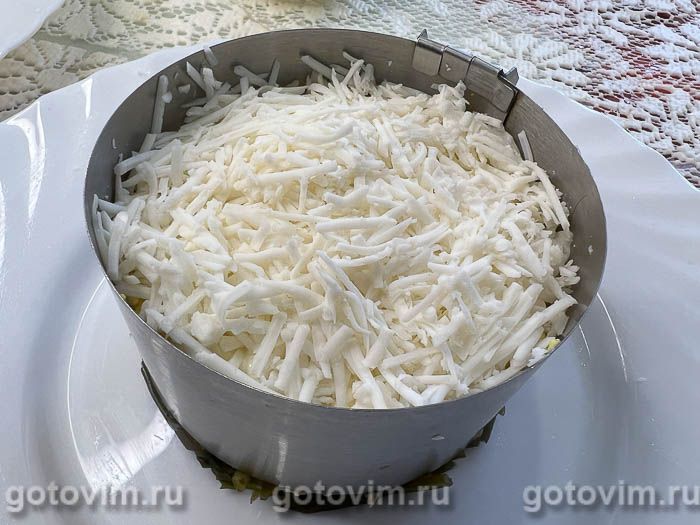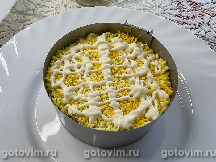 Далее распределить тертые яичные желтки и нанести слой майонеза.