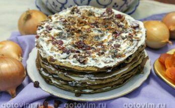 Печеночный торт с карамелизированным луком и клюквой. Рецепт с фото