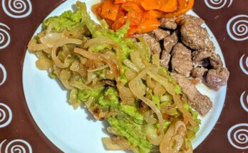 Поджарка из свинины с овощами в духовке и пюре из зелёного горошка. Рецепт с фото