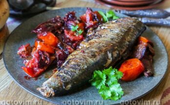 Сельдь, жаренная с помидорами, сливами и чесноком в соевом соусе. Рецепт с фото