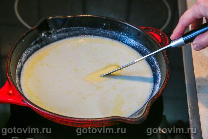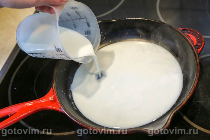 Для приготовления молочной заливки вскипятить в глубокой сковороде молоко. Снять сковороду с плиты.