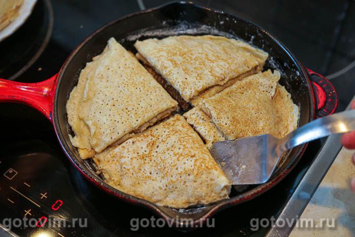 Блинчики сложить пополам, а потом — еще раз, чтобы получился треугольник. Выкладывать треугольники из блинов в 2-3 слоя в заливку прямо в сковороду. Затем лопаткой перевернуть стопку из блинов, чтобы верхний слой оказался внизу. Прикрыть крышкой сковороду с блинами в молочной заливке и готовить на слабом огне примерно 5 минут или пока заливка не впитается в блины.