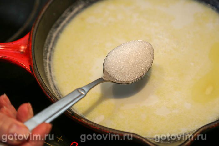 и сахар. Размешать, чтобы сахарные кристаллы растворились. По желанию молочную заливку можно ароматизировать ванильной эссенцией или ванильным сахаром.
