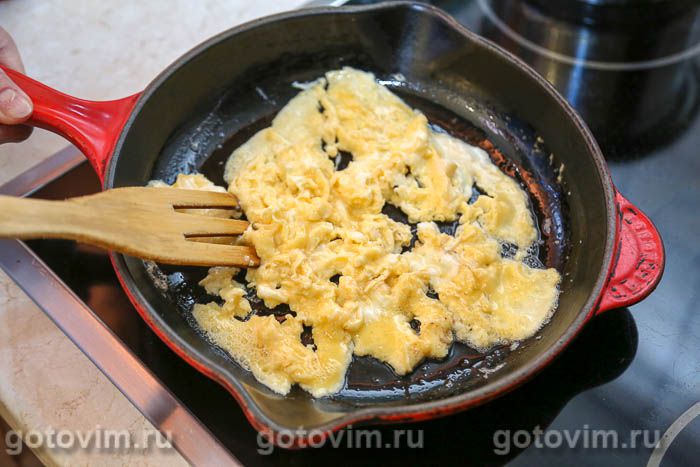 и сразу аккуратно «помешивать» деревянной лопаткой , чтобы они обжаривались не ровным слоем, а образуя бугристую поверхность. Яичница получится как бы собранной из отдельных кусочков.