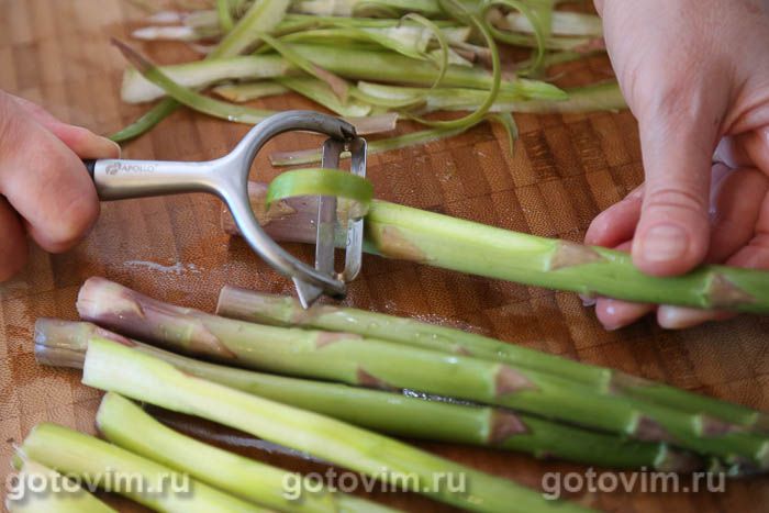 Первый способ подробно описан в этом рецепте. Достаточно просто согнуть побег недалеко от основания. Там, где он сломается, обычно заканчивается грубая часть ростка длиной 3-4 см. Их не выбрасывайте! Грубые части побегов спаржи используйте для приготовления овощного бульона для других блюд.