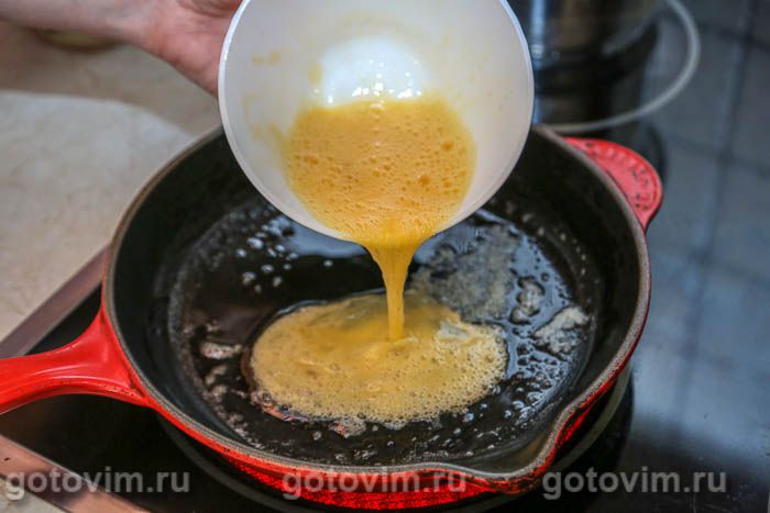 В сковороде растопить сливочное масло. Вылить взбитые яйца в сковороду