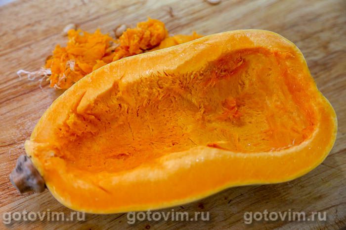 Для приготовления тыквенного пюре тыкву надо запечь. Для этого разрезать тыкву пополам, вычистить ложкой семена и волокна.