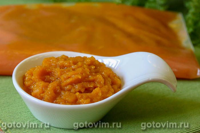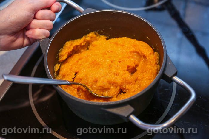 После этого переложить тыквенную мякоть в кастрюлю с толстым дном, размять картофеледавилкой или пробить погружным блендером, и варить, помешивая, пока большая часть влаги не испарится и пюре не станет густым. Оставить тыквенное пюре при комнатной температуре до полного охлаждения, а затем разложить по пакетам и убрать в морозилку. Тыквенное пюре на зиму готово.