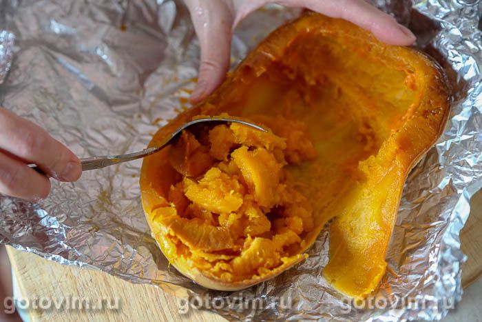 Когда тыква остынет, аккуратно выскрести мякоть ложкой.
