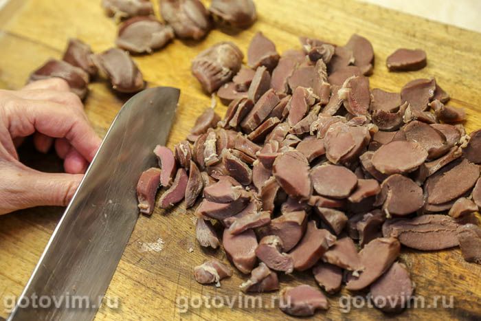 Вареные утиные желудки нарезать ломтиками.