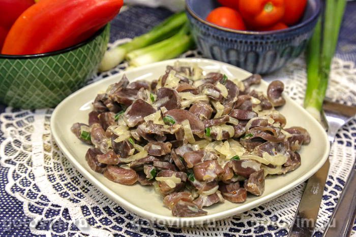 Обычно со сметаной и горчицей я готовлю куриную печень, но решила попробовать примерно так же потушить утиные желудки. Получилось хорошо! Желудки отварила, нарезала ломтиками и после отправила в кастрюлю доходить до кондиции вместе со сметаной, горчицей и пассерованным луком.