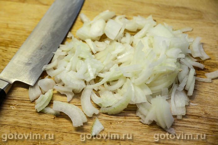 Лук очистить и нарезать полукольцами или как вам больше нравится. Я порубила его четвертькольцами.