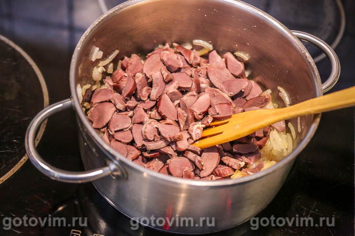 Добавить к пассерованному луку нарезанные ломтиками вареные утиные желудочки, посолить и перемешать. Готовить, помешивая, 1-2 минуты.