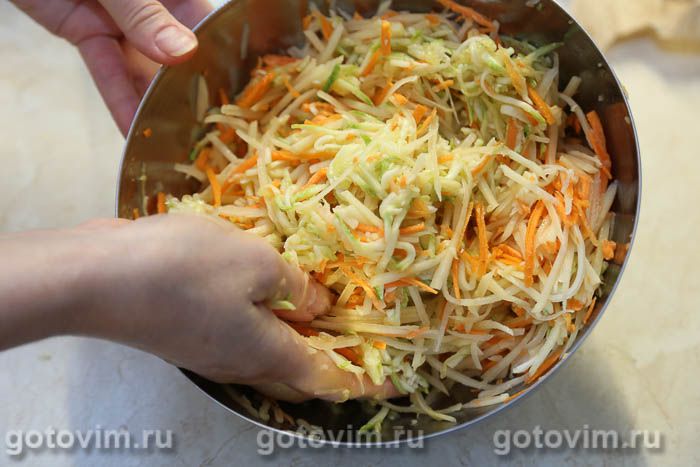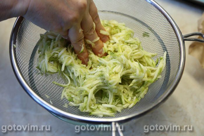 Тертые кабачки посолить, оставить на 10-15 минут, чтобы они дали сок, а затем хорошо отжать.