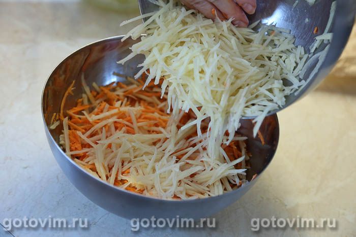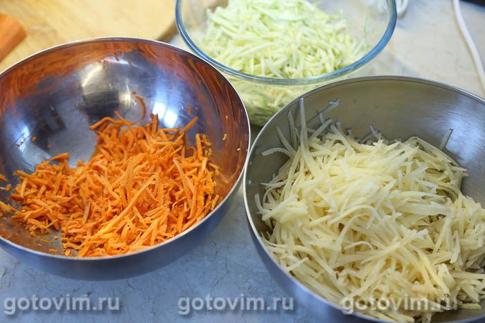 В миске смешать картофель с морковь и кабачками.