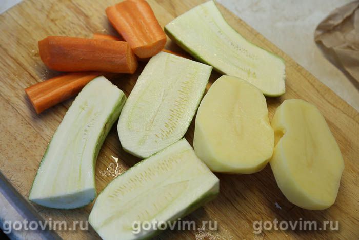 Подготовить овощи для запеканки. Картофель и морковь очистить. Кабачок вымыть.