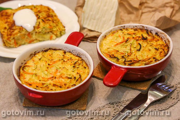 За это время запеканка хорошо подрумянится. Если верх запеканки начнет подгорать, прикрыть её фольгой и продолжать готовить, пока овощи станут мягкими, а смесь из яйца и сметаны схватится, благодаря чему запеканка будет хорошо держать форму и её легко будет нарезать на порционные кусочки (если вы готовили блюдо в одной большой форме). Готовую запеканку из тертых кабачков с картофелем подавать на стол горячей как основное блюдо или гарнир. Приятного аппетита!