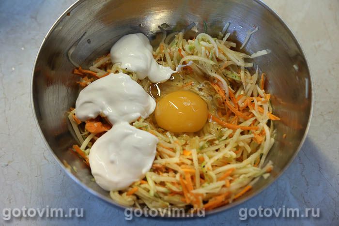 Примешать сметану и яйцо. Они должны равномерно распределиться в овощной массе.